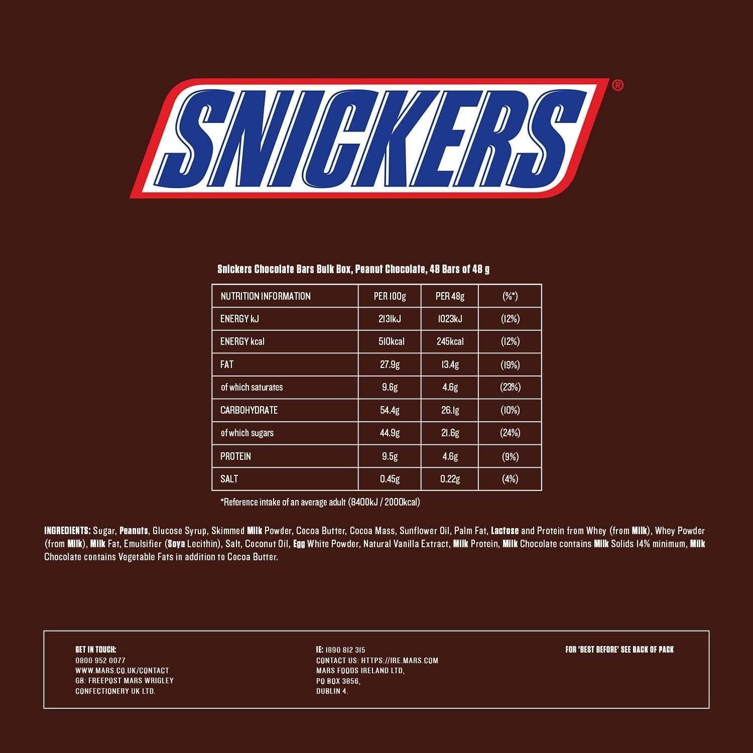 • 1 x Chocolate Bulk Box of 48 Snickers bars, each bar 48g.
