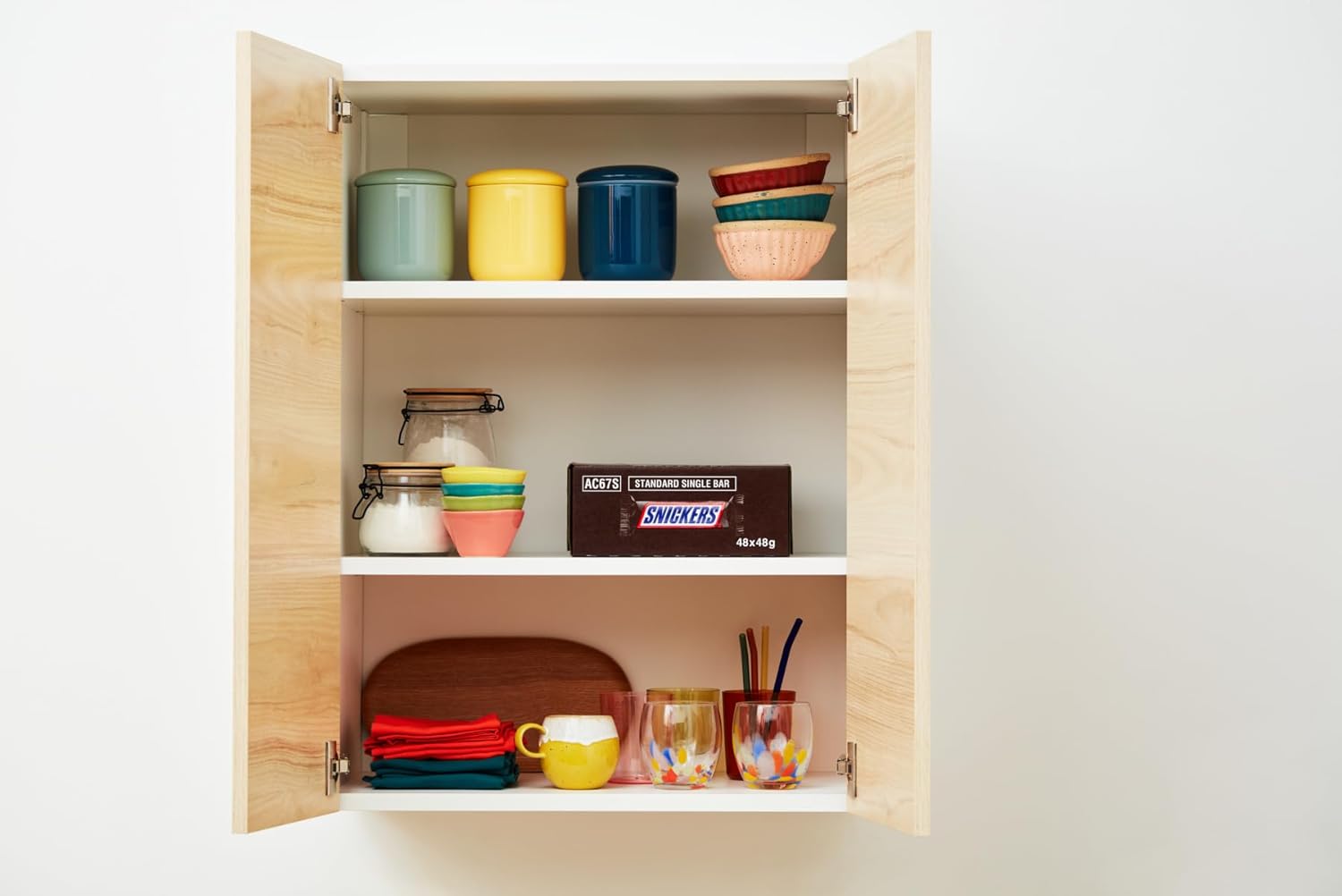A bulk box of chocolate bars with 48 full-sized Snickers milk chocolate bars. Each one is crammed with roasted peanuts, rich caramel, soft nougat, and coated in a layer of smooth milk chocolate. These Snickers snacks bars will always keep you on track. Try some basic arithmetic. Your cupboards + this chocolate bulk pack = snack satisfaction. (Or ‘snackisfaction’.) A chocolate bars bulk box that contains 48 Snickers chocolate bar snacks in 48g.